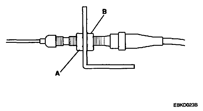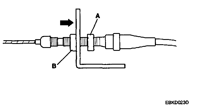 6. Pull the cable assembly so that the adjusting nut (A) touches the bracket, and tighten the locknut (B).