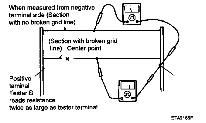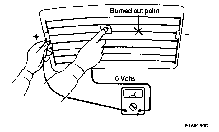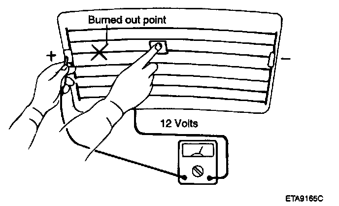 5. Use an ohmmeter to measure the resistance of each heater line between a terminal and the center of a grid line, and between the same terminal and the center of one adjacent heater line. The section with a broken heater line will have a resistance twice as that in other sections. In the affected section, move the test lead to a position where the resistance sharply changes.