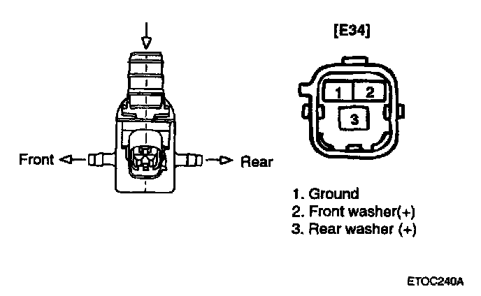 2. Connect positive (+) and negative (-) battery cables to terminals 2 and 1 respectively to see that the washer motor runs and water sprays from the front nozzles.