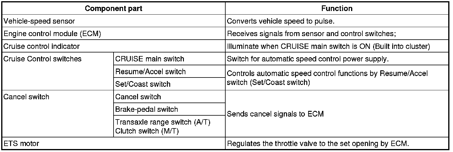 The main components of cruise control system are mode control switches, transaxle range switch, brake switch, vehicle speed sensor, ECM and ETS motor that connect throttle body.