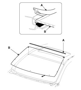 8. Remove the windshield molding (A) from the edge of the windshield glass (B).