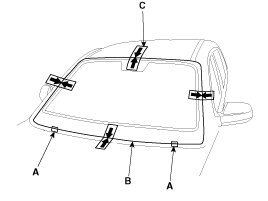 4. Install the spacer (A) install the windshield glass (B) temporarily with marking sure to position them on the center, and then place the alignment mark (C).
