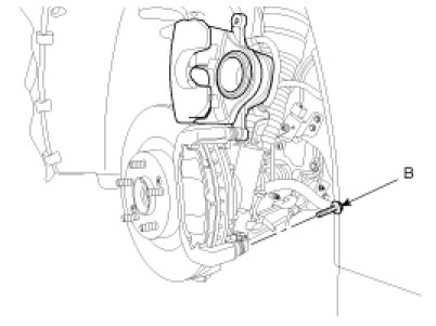 2. Loosen the guide rod bolt (B) and pivot the caliper up out of the way.