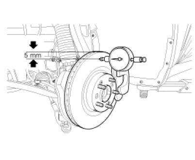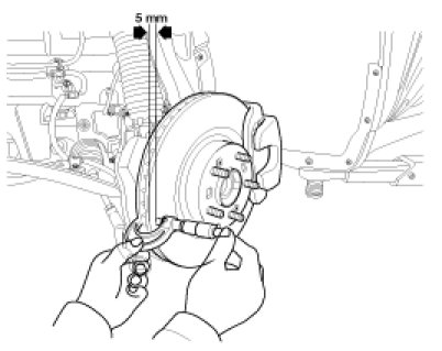 1. Place a dial gauge about 5mm (0.2 in.) from the outer circumference of the brake disc, and measure the runout of the disc.