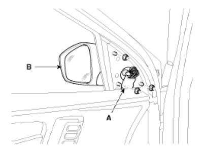 2. After disconnecting the connector (A), remove the outside rear view mirror (B).