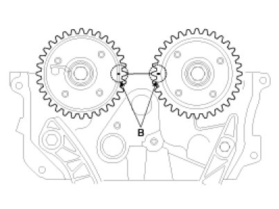 3. Set the crankshaft so that the key (A) of crankshaft will be aligned with the mating surface of main bearing cap. Put the intake and exhaust camshaft assembly so that the TDC marks (B) of the intake and exhaust CVVT sprockets will be aligned with the top surface of cylinder head. As a result of this, the piston of No.1 cylinder is placed at the top dead center on compression stroke.