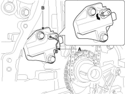 31. Release the ratchet by pulling the link down using a thin rod. Compress the piston and then insert a stopper pin (A) into the hole on the ratchet to hold the compressed piston. Remove the timing chain tensioner (B).