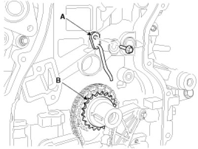 2. Install the crankshaft chain sprocket (B) and the timing chain oil jet (A).