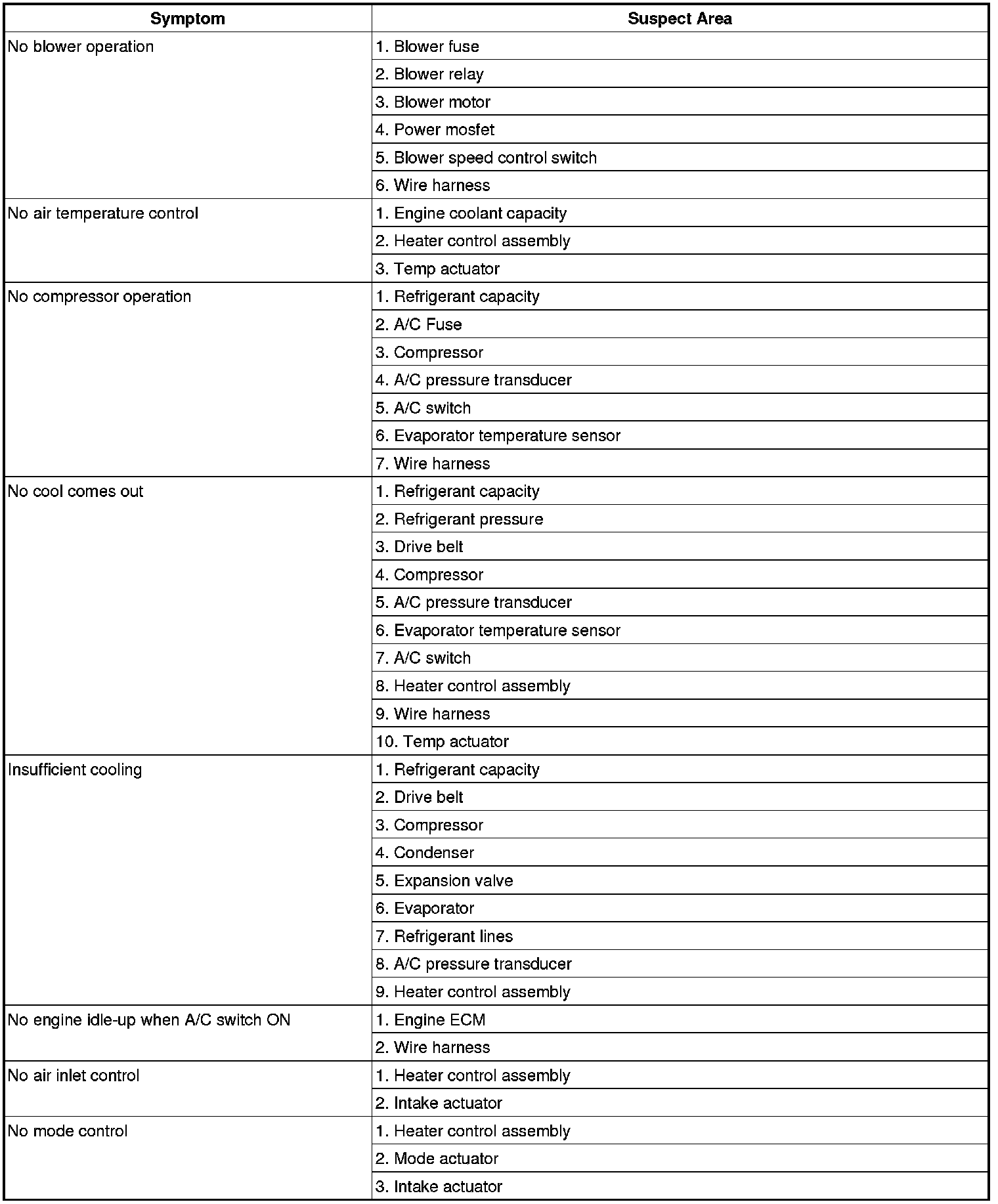 Problem Symptoms Table