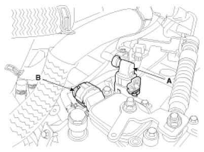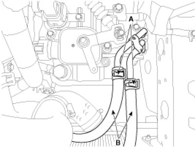 5. Disconnect the hose (B) after removing the automatic transaxle fluid cooler hose clamp (A).