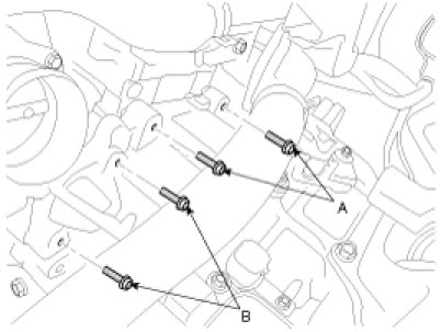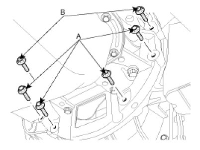 7. Remove the automatic transaxle upper mounting bolt (A-2ea) and the starter motor mounting bolt (B-2ea).