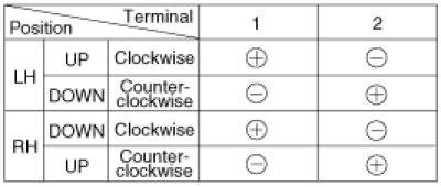 4. Connect the motor terminals directly to battery voltage (12V) and check that the motor operates smoothly. Next, reverse the polarity and check that the motor operates smoothly in the reverse direction. If the operation is abnormal, replace the motor.