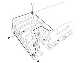 2. Unfasten bolt (A) and nut (B) and then remove the rear cover of the high voltage battery (C).