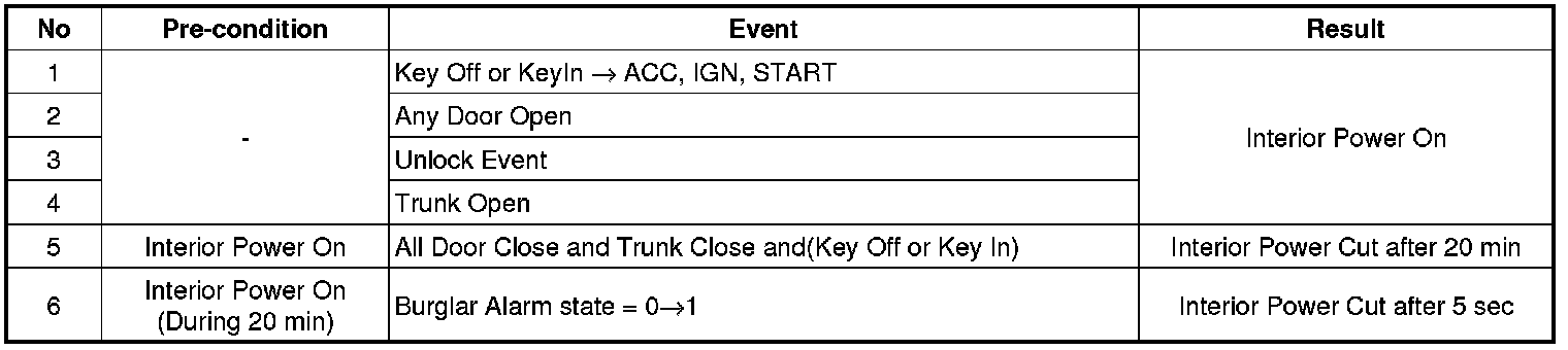 7. ALL DOOR UNLOCK signal is output (only once) during 1s if Driver door switch is CLOSE within 0.5s from Driver Unlock State UNLOCK -> LOCK under IGN KEY ON.