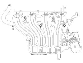 - When installing the intake manifold, tighten the bolts and nuts with pre-torque first, and then tighten the bolts and nuts with specified torque in the sequence shown.