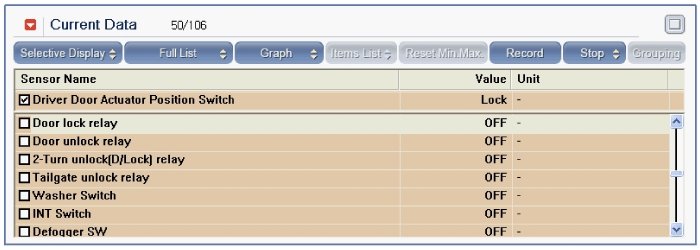 4. Select "Current data", if you will check current data of power door lock system. It provides input/output status of SJB.