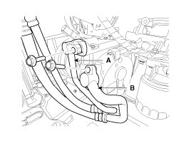 8. Remove the bolts, then disconnect the suction line (A) and discharge line (B) from the compressor. Plug or cap the lines immediately after disconnecting them to avoid moisture and dust contamination.