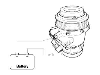 3. Check operation of the magnetic clutch.Connect the compressor side terminals to the battery (+) terminal and the ground battery (-) terminal to the compressor body.Check the magnetic clutch operating noise to determine the condition.