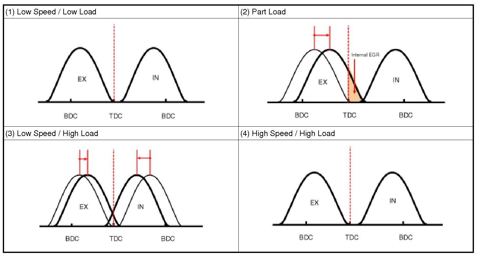 By controlling CVVT, the valve over-lap or under-lap occurs, which makes better fuel economy and reduces exhaust gases (NOx, HC) and improves engine performance through reduction of pumping loss, internal EGR effect, improvement of combustion stability, improvement of volumetric efficiency, and increase of expansion work.