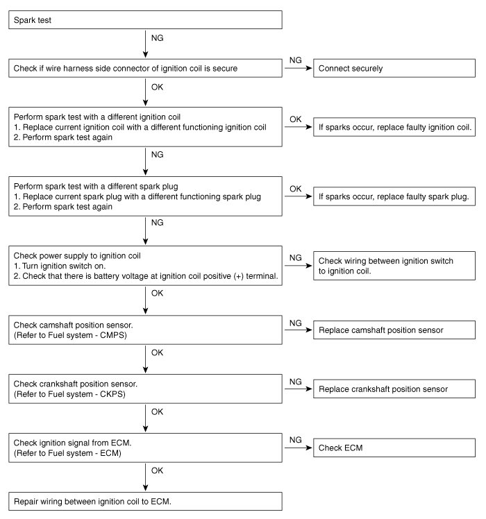 Inspect ignition coil assembly and Perform spark test