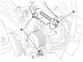 2. Loosen the mounting bolts (A) and then, turn the adjusting bolt (B) clockwise to loosen tension.