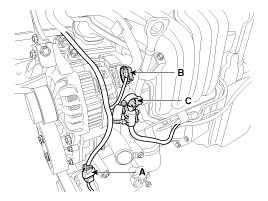 4. Disconnect the air compressor connector (A) and the alternator connector (B), and remove the cable from alternator "B" terminal (C).