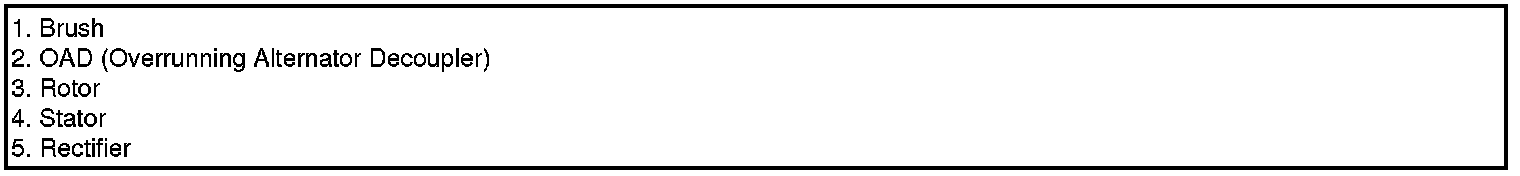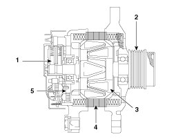 The alternator is regulated by the battery voltage detection system. The main components of the alternator are the rotor, stator, rectifier, capacitor brushes, bearings and V-ribbed belt pulley. The brush holder contains a built-in electronic voltage regulator.