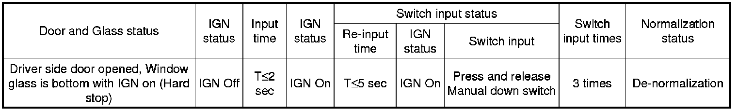3. Driver side door opened and window glass is at the bottom (hard stop position) with IGN on, IGN off -> within 2 sec, IGN on -> Press Manual Down switch 3 times within 5 sec -> De-normalization