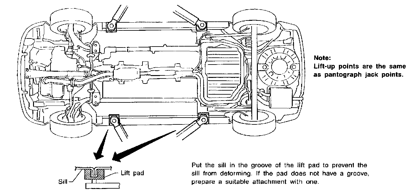 - When setting the lift arm, do not allow the arm to contact the brake tubes, brake cable and fuel lines and sill spoiler.