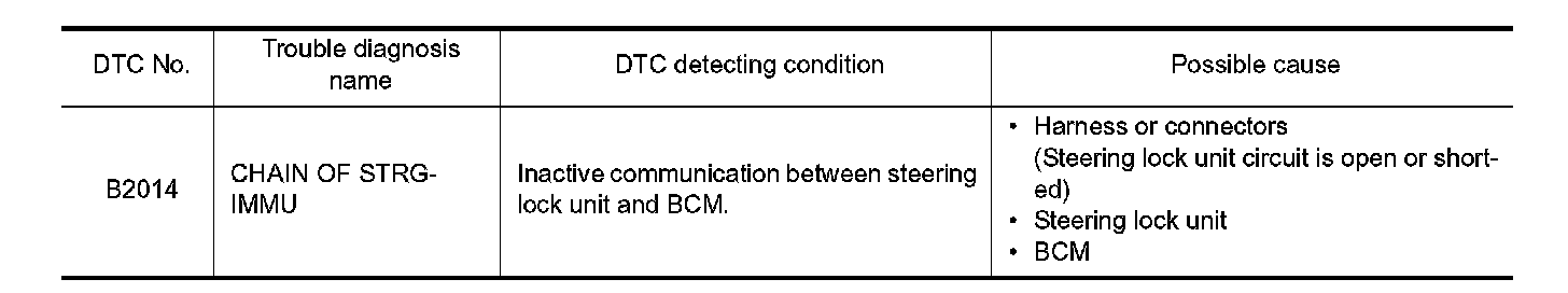 BCM performs the ID verification with the steering lock unit to release the steering. BCM starts the communication with the steering lock unit when Intelligent Key is carried into the passenger compartment and the push-button ignition switch is pressed.