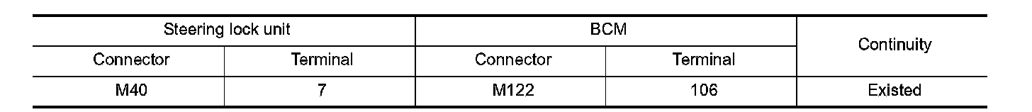 2. Check continuity between steering lock unit harness connector and BCM harness connector.