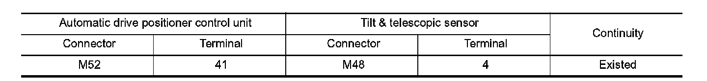 3. Check continuity between automatic drive positioner control unit harness connector and tilt & telescopic sensor harness connector.