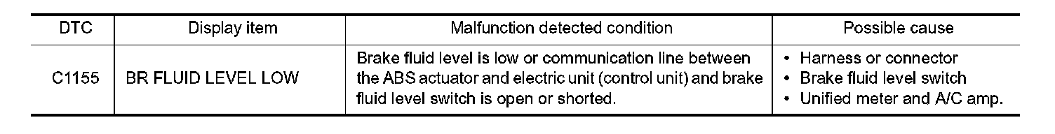The brake fluid level switch converts the brake fluid level to an electric signal and transmits it to the ABS actuator and electric unit (control unit).