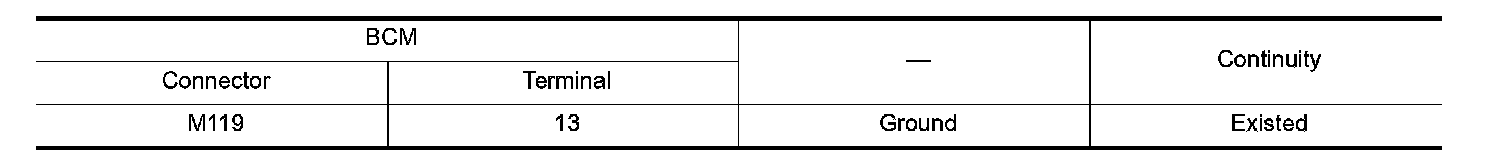 - Harness for short or open between battery and BCM harness connector M119 terminal 11.