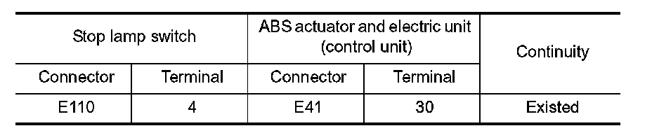3. Check continuity between stop lamp switch harness connector and ABS actuator and electric unit (control unit) harness connector.