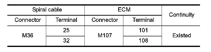 2. Check for continuity between the spiral cable harness connector and ECM harness connector.