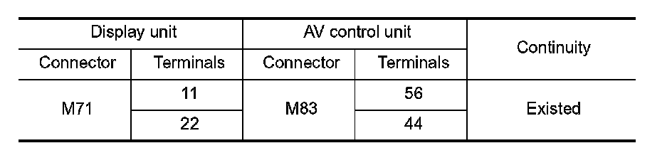 3. Check continuity between display unit harness connector and AV control unit harness connector.