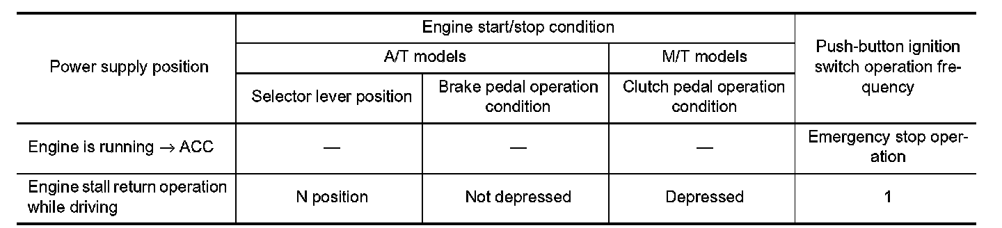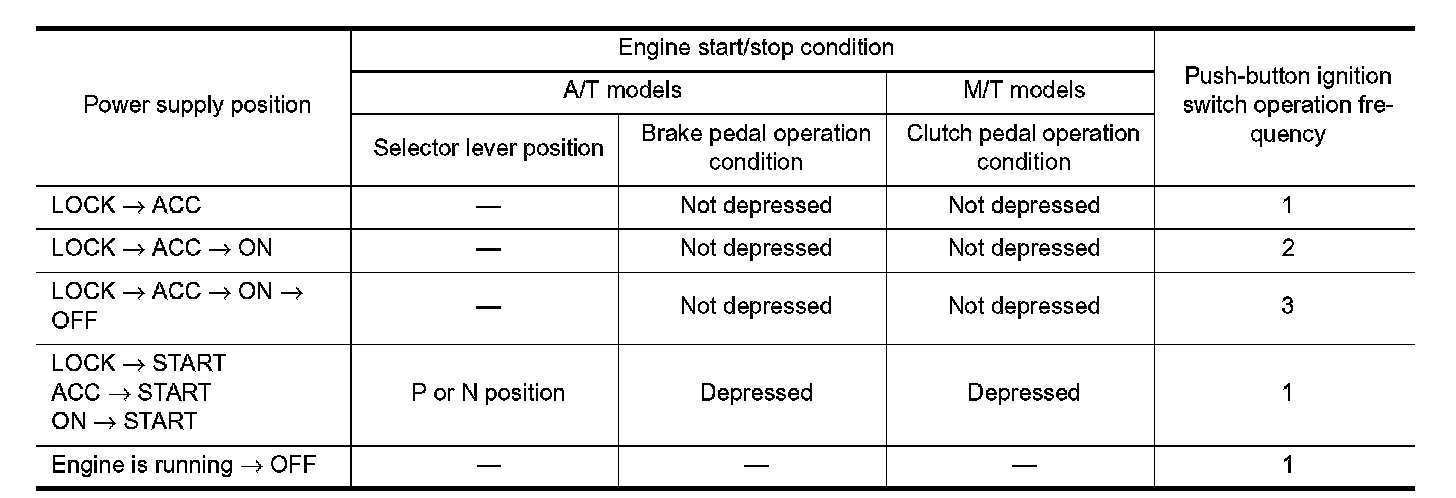 POWER SUPPLY POSITION CHANGE TABLE BY PUSH-BUTTON IGNITION SWITCH OPERATION