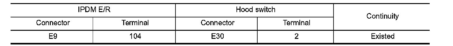 2. Check continuity between IPDM E/R harness connector and hood switch harness connector.