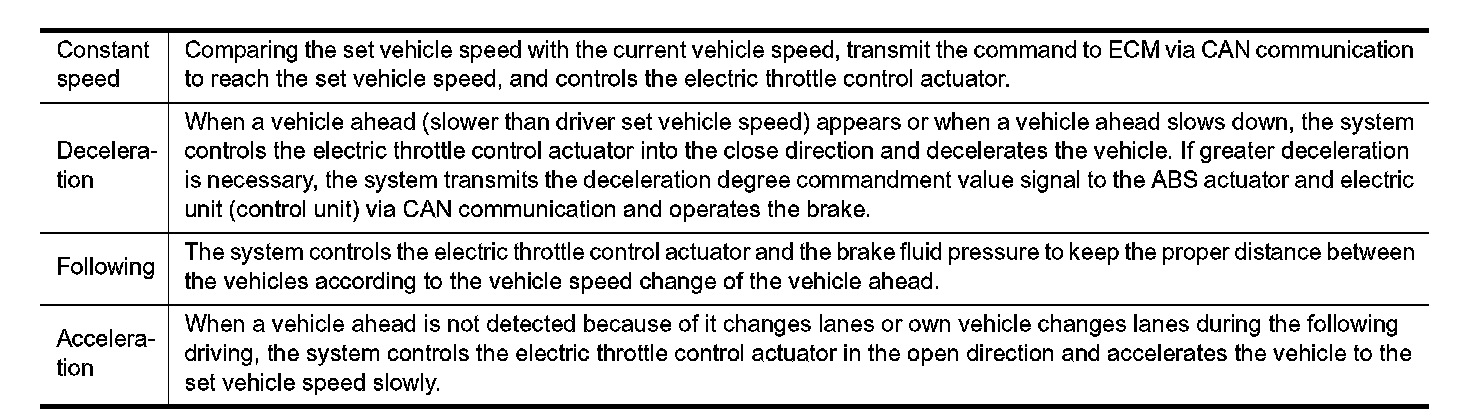 The following items are controlled in the vehicle-to-vehicle distance control mode.