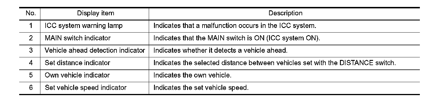 The MAIN switch indicator (cruise indicator), set distance indicator, own vehicle indicator, and set vehicle speed indicator come on and ICC system is set to a standby state.
