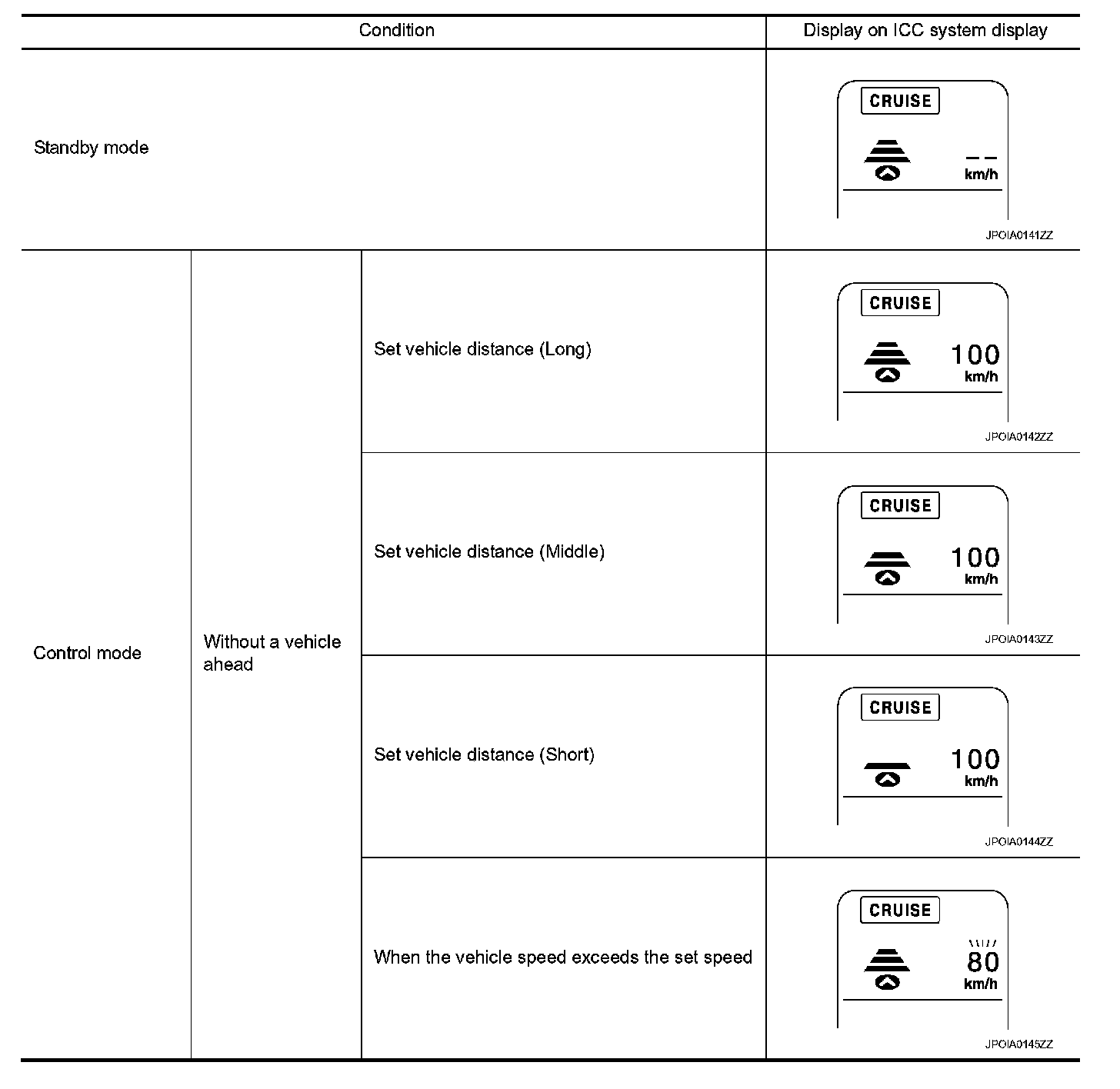 - When there are no vehicles traveling ahead, the vehicle-to-vehicle distance control mode maintains the speed set by the driver. The set speed range is between approximately 40 and 144 km/h (25 and 90 MPH).