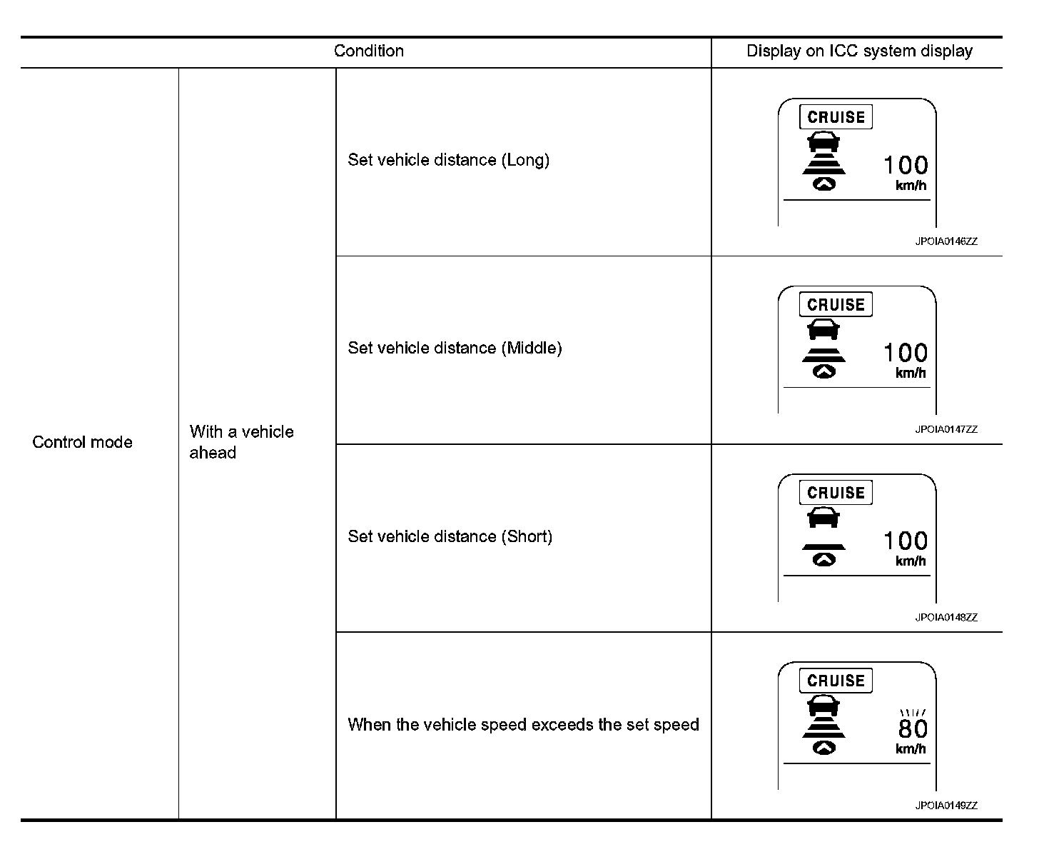 - When there is a vehicle traveling ahead, the vehicle-to-vehicle distance control mode adjusts the speed to maintain the distance, selected by driver, from a vehicle ahead. The adjusting speed range is between approximately 32 km/h (20 MPH) and up to the set speed.