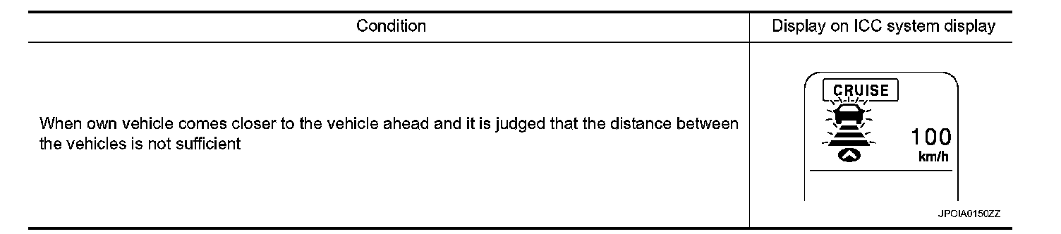 If own vehicle comes closer to a vehicle ahead due to rapid deceleration of that vehicle or if another vehicle cuts in, the system warns the driver with the chime and ICC system display. Decelerate by depressing the brake pedal to maintain a safe vehicle distance if: