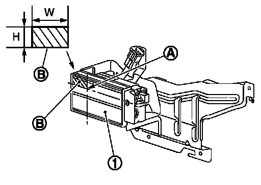 - The center of laser beam axis (A) is located at 38 mm (1.5 in) (W) from the left end of ICC sensor integrated unit and 22 mm (H) (0.87 in) from above when viewed from the front of the vehicle.