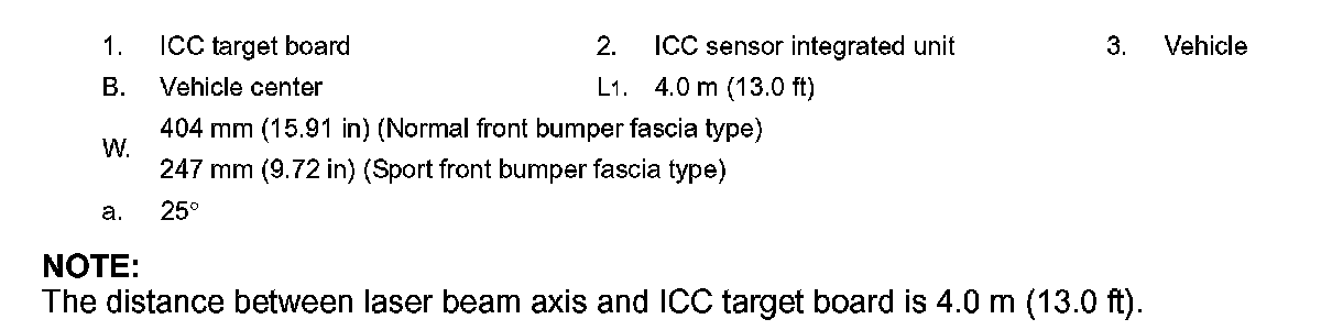 Then mark a point 3.9 m (12.8 ft) position ahead of the front bumper. Then, adjust the position of the ICC target board so that the weight comes on the top of the marked point [3.9 m (12.8 ft) position ahead of the front bumper] and face to the vehicle.