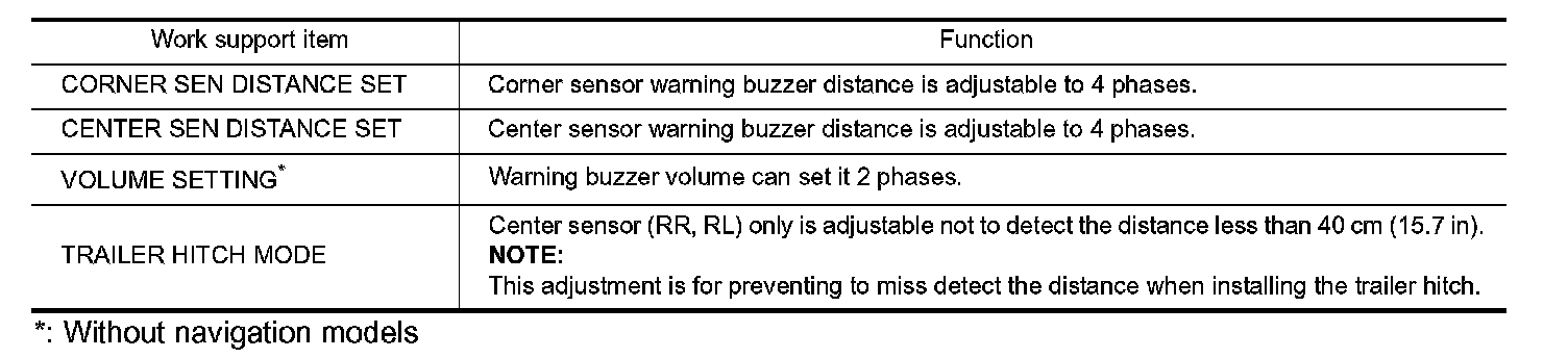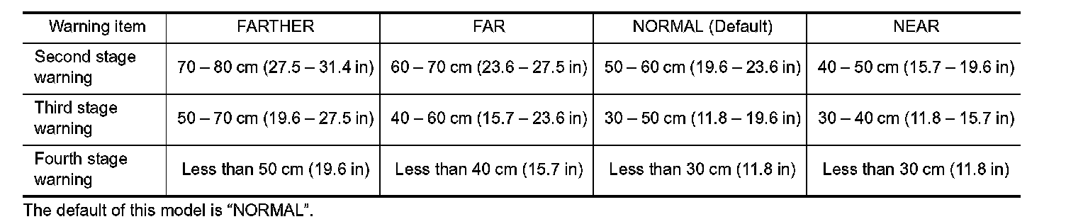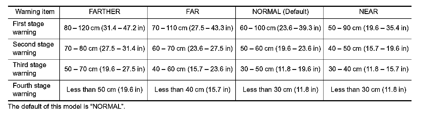 Center sensor (RR, RL) only is adjustable not to detect the distance less than 40 cm (15.7 in).