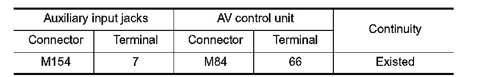3. Check continuity between auxiliary input jacks harness connector and AV control unit harness connector.
