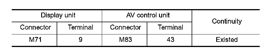 3. Check continuity between display unit harness connector and AV control unit harness connector.