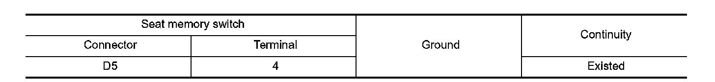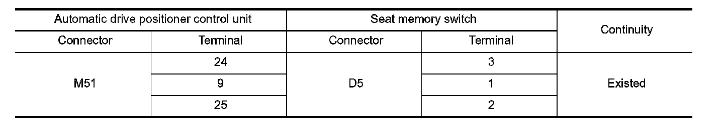 3. Check continuity between automatic drive positioner control unit harness connector and seat memory switch harness connector.